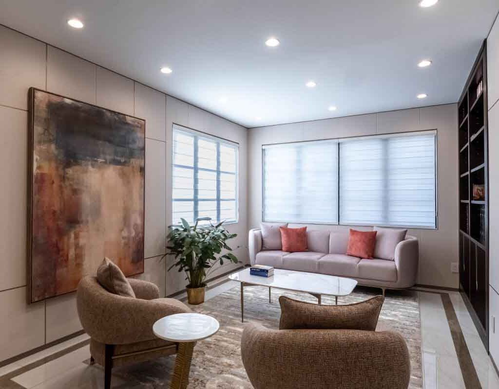 Custom window treatments diffuse natural light across the room, enhancing the soft-beige paneling. Plants and rich accent materials add contrast without disrupting the minimal aesthetic.
